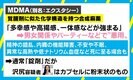 MDMAは別名「エクスタシー」と呼ばれる、覚醒剤に似た化学構造を持つ合成麻薬。多幸感や高揚感、一体感などが強まり、男女関係やパーティーなどで悪用されることが多い。一方で、精神の錯乱や内臓の機能障害、不安・不眠、異常な高熱や低ナトリウム血症など死に至るケースもあるという。