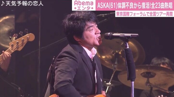 ASKA「ハラハラさせてすみません」体調不良から復活、全23曲を熱唱 2020/01/10 12:03 拡大する 歌手のASKA(61)が1月9日、全国ツアーの東京公演を行った。 急性咽頭炎と発熱のため6日に予定されていた大阪公演と公開リハーサルを延期したASKA。この日のコンサートでは途中、ファンに向けて「ハラハラさせてすみません。急にあの日だけガーンと熱があがり。1日寝っぱなしで覚えていなく…。“東京も危ないんじゃないかな”と周りに言われていましたが、回復できました。どうもすいません」と謝罪した。 3月には、ニューアルバムの発売も予定しているASKA。集まったファンの前で、「僕はMusic」「HELLO」「天気予報の恋人」など全23曲を披露した。 続きを読む