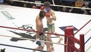 1ラウンド終了残り10秒、なんとか立ち上がった川崎だが、足元はおぼつかない。試合続行不可能と判断したレフェリーがゴングを要求した。