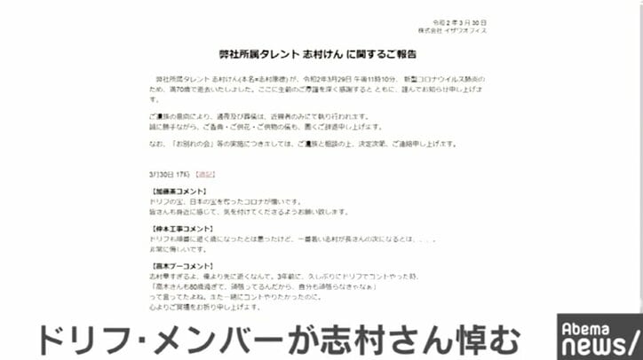 タレントの志村けんさんが亡くなったことを受け、「ザ・ドリフターズ」メンバーの加藤茶、仲本工事、高木ブーが所属事務所を通じてコメントを発表した。メンバーのコメントは次の通り。