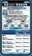 まず、亀次郎さんが説明を聞きに行った“1世帯あたり30万円の現金給付”は今回の新型コロナウイルスによる緊急経済策に含まれ得るもので、対象は今年2~6月の間に一度でも月収が減り、その減り幅において月収が半減した月があるか否かによって条件が異なってくる。