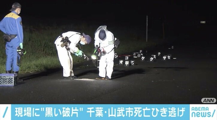 死亡ひき逃げ事件か 現場に車の部品のような“黒い破片” 千葉・山武市 2020/07/10 11:01 拡大する 千葉県山武市で、男性が路上で死亡しているのが見つかった。周辺には車の部品のようなものが落ちており、警察は死亡ひき逃げ事件として捜査している。 9日午後8時前、山武市の木戸川沿いの道路を車で走行していた女性から「道路脇で横たわっている人をみた」と通報があった。警察などが駆け付けたところ、頭から血を流した男性が路上に倒れており、すでに死亡していた。周辺には車の部品とみられる黒い破片が落ちていたという。 続きを読む