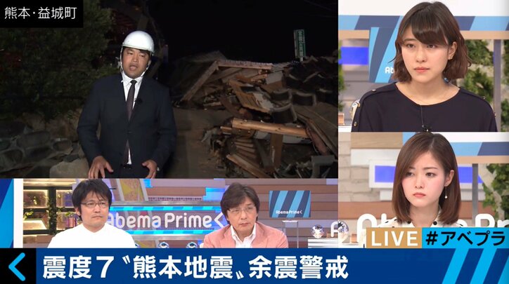 熊本地震 トヨタなど大手が続々工場停止、「経済への影響大」との懸念 2016/04/15 14:55 拡大する 15日の『AbemaPrime』(AbemaTV)では、プライムキャスター・小松靖アナ(テレビ朝日)のほか、MCをエンジニアタレントの池澤あやかとデザイナー・実業家のハヤカワ五味、アシスタントはタレント・黒田凛が務めた。また金曜コメンテーターとして、東洋経済オンライン編集長・山田俊治氏と、経済評論家の川口一晃が出演した。ニュースコーナーでは、14日に震度7強を記録した熊本県益城町の宮園地区から中継がおこなわれた。現地では、避難所を想定して作っていた公民館が倒壊し、瓦礫が道路まではみ出しているなど、甚大な被害が深刻となっている。 続きを読む