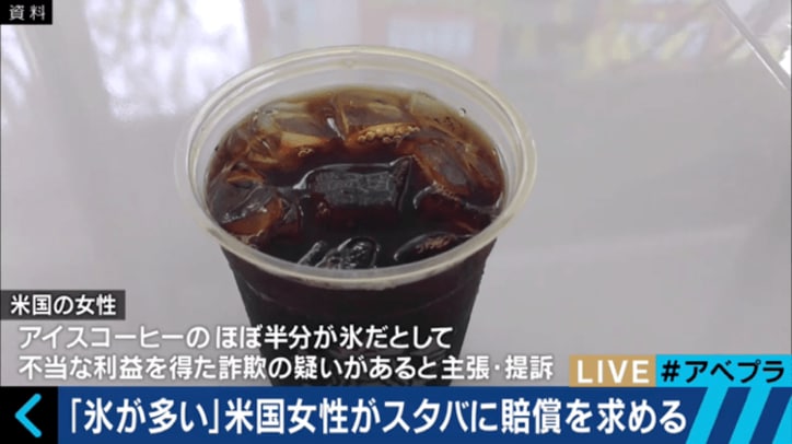アメリカで「スタバの氷が多すぎる」と訴訟 尾木ママ「TPPが始まったら日本でも起こる」 2016/05/04 03:00 拡大する 大手コーヒーチェーンの「スターバックスコーヒー」に対し、米国シカゴに住む女性が起こした訴訟に注目が集まっている。この女性が起こした訴訟は、アイスコーヒーの「ほぼ半分が氷だ」としてスターバックスコーヒーが詐欺で不当な利益を得ているとして500万ドル(約5億円)の賠償を求めているというもの。スターバックス側は「根拠が無いと信じている。冷たいドリンクには氷が不可欠。客が満足していないなら作りなおす」とコメント。 続きを読む