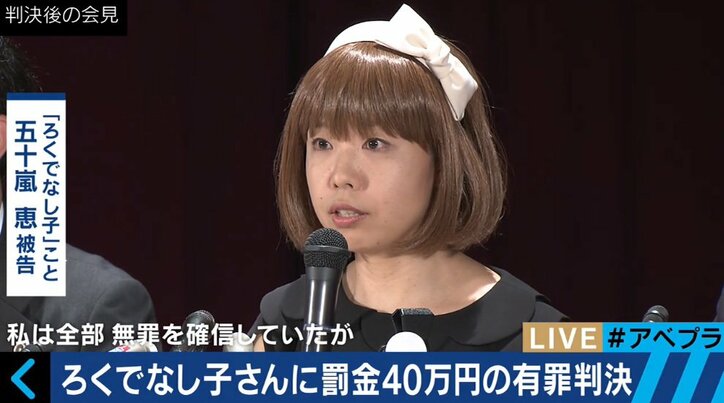 ろくでなし子氏のわいせつ裁判 ウーマン村本、「権力がアーティストを封じるな」 2016/05/09 13:00 拡大する 5月9日、東京地裁でいわゆる「わいせつ裁判」の一審判決が出た。これは漫画家・ろくでなし子氏が、女性器を元にしたアート作品を発表し、さらには自身の女性器の3Dデータを配付したことの「わいせつ性」についての裁判だ。結果、同氏が以下のようにツイッターで報告した通りの一審判決となった。「(半ケツ出たYO! ろくでなし子事件、一部無罪(デコまんは無罪、3Dデータは有罪)。罰金40万円(求刑罰金80万円)」これは、自身の性器をモチーフとした作品を陳列したことについては無罪で、3Dデータで配布したことについては有罪となった形だ。この件について、AbemaTVの報道番組『AbemaPrime』の5月9日オンエアの回で取り上げられたが、ろくでなし子氏は先月同番組に生出演していた。その時は「私の体の一部なのでわいせつと言われるのは心外」などと語っていた。 続きを読む
