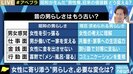 また、ジェンダーに関わる疑問をコラムで発信している、はましゃか氏も「何を“男らしさ”と呼ぶかを決めていくということよりも、“男らしさ”という言葉自体、平成に置いていきたいという気持ちだ。弱音を吐いたり、泣いたりする人も男の人だし、女性に養ってもらっている人だって男の人。いろんな男の人がいていいと思う。こういう議論の根底にあるのは、女の人のことがすごく好きだったり、モテたりするような男の人、あるいは高収入だったり、ラベルや肩書に頼っている男の人たちの存在がある気がしていて、そうではない人は議論から外されてしまうと思う。銭湯で掃除の女性に裸を見られるのが恥ずかしいという男性、飲み会で裸になるのが嫌だという男性もいる。そういうことを押し付け合わない世界になっていけたらいい」とした。