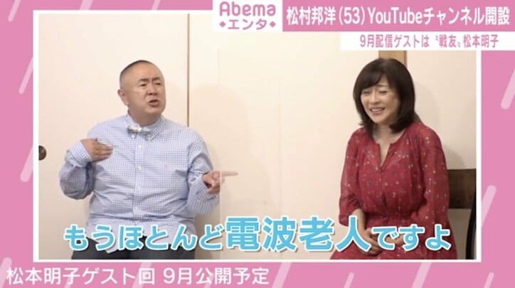 「砂漠で遭難して...」松村邦洋、YouTubeチャンネル開設 “戦友”松本明子と『電波少年』語る 2020/08/21 14:30 拡大する 100種類以上のモノマネレパートリーを持つお笑いタレントの松村邦洋(53)が20日、YouTubeチャンネルを開設した。 同チャンネルでは、特技のアートや抜群の記憶力を活かしたマニアックなトークを発信していくといい、ゆかりのあるゲストタレントも注目の1つ。今回のゲストは30年来の付き合いとなる松本明子(54)。 冒頭、松本は「『電波少年』の戦友ですね。一緒に苦楽を共にした仲間ですね」とコメント。『電波少年シリーズ』とは1992年から、およそ10年にわたり、日曜よる10時30分に数々の「体当たり企画」で話題を提供した番組。有吉弘行(46)が当時組んでいたコンビ『猿岩石』がヒッチハイクでユーラシア大陸を横断する企画が大ヒットし全盛期は最高視聴率30.4%を獲得するなど多くの伝説を残した。 続きを読む