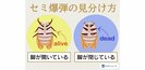 ウェザーニュースが7870人に向けて行った調査によると、この夏3人に1人がすでに”セミ爆弾”の被害にあっているようだ。”セミ爆弾”か否かの見分け方としては、セミの脚が開いているとまだ生きており、脚が閉じていると死んでいる可能性が高いという。
