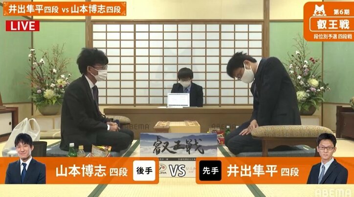 井出隼平四段 対 山本博志四段 本戦目指し初戦に登場/将棋・叡王戦 将棋 2021/01/20 14:02 拡大する 将棋の叡王戦段位別予選(四段戦)が1月20日に行われ、井出隼平四段(29)と山本博志四段(24)が午後2時から対局を開始した。勝者は次局、杉本和陽四段(29)と対戦する。【中継】叡王戦予選 井出隼平四段-山本博志四段 井出四段は、2016年4月に四段昇段。竜王戦6組、順位戦C級2組。第6期の加古川青流戦で優勝歴がある。 山本四段は、2018年10月に四段昇段。竜王戦6組、順位戦C級2組。振り飛車党で、中でも三間飛車の使い手として知られている。 続きを読む