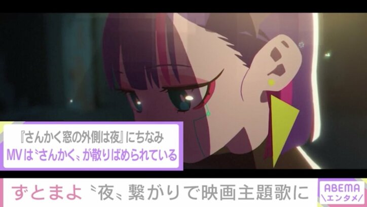 ずっと真夜中でいいのに。映画『さんかく窓の外側は夜』の主題歌「暗く黒く」のMVを公開 2021/01/21 17:53 拡大する YouTubeの総再生回数が2億8000万回を超えるアーティスト「ずっと真夜中でいいのに。」が21日、新曲「暗く黒く」のミュージックビデオを公開した。【映像】ずとまよ “夜”繋がりで映画主題歌に 同曲は、俳優の岡田将生(31)と志尊淳(25)がダブル主演を務める映画『さんかく窓の外側は夜』の主題歌で、映画のタイトルとアーティスト名にお互いに『夜』という共通点があることから主題歌を担当することになった。公開されたミュージックビデオは、映画のタイトルにちなんで「さんかく」が随所に散りばめられている。 続きを読む