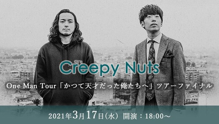 Creepy Nutsのワンマンツアー「かつて天才だった俺たちへ」のツアーファイナルを、全国のカラオケルームで堪能! JOYSOUNDの「みるハコ」で、3月17日(水)ライブ・ビューイング決定! 2021/03/12 11:22 拡大する Creepy Nutsのワンマンツアー「かつて天才だった俺たちへ」のツアーファイナルを、全国のカラオケルームで堪能! JOYSOUNDの「みるハコ」で、3月17日(水)ライブ・ビューイング決定!日本最高峰のMCバトル「ULTIMATE MC BATTLE GRAND CHAMPION SHIP」で三連覇を成し遂げたラッパー・R-指定と、世界最大規模のDJ大会「DMC WORLD DJ CHAMPIONSHIPS 2019」で優勝したDJ 松永による、HIP HOPユニット「Creepy Nuts」。 続きを読む