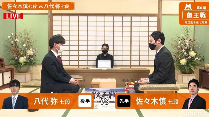 佐々木慎七段-八代弥七段 対局開始 勝者は午後7時からもう一局/将棋・叡王戦 将棋 2021/03/18 14:05 拡大する 将棋の叡王戦段位別予選(七段戦)が3月18日に行われ、佐々木慎七段(41)と八代弥七段(27)が午後2時から対局を開始した。勝者は午後7時から、片上大輔七段(39)と対戦する。【中継】叡王戦 段位別予選 佐々木慎七段-八代弥七段 佐々木七段は、2001年4月に四段昇段。竜王戦4組、順位戦B級2組。2020年度の成績は17勝16敗、勝率.5151。 八代七段は、2012年4月に四段昇段。竜王戦2組、順位戦C級2組。2016年度には、全棋士参加の朝日杯将棋オープン戦で優勝歴がある。2020年度の成績は、28勝10敗、勝率.7368と活躍している。 続きを読む