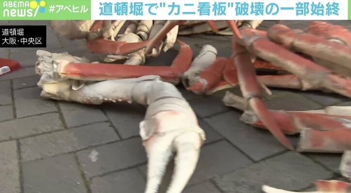 カニの脚がバラバラに…大阪道頓堀で“看板”破壊 悪質行為に社長「絶対に許せない」 ABEMAヒルズ 2021/04/07 15:58 拡大する 5日早朝、大阪の道頓堀商店街でカニ料理店のオブジェが壊された。防犯カメラが犯行の瞬間を捉えている。 路上に落ちているのは、バラバラになったカニの足。これらはカニ料理店の店頭に置かれていたオブジェだ。【映像】破壊された約150万円の「カニ」(3分ごろ~) 防犯カメラの映像には、店先に置かれたカニのオブジェに近づく赤い服の男が映っている。オブジェを揺すったり、登ろうとしたりする赤い服の男。それをもう1人の男が、煽るように動画を撮影しているように見える。 続きを読む