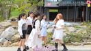 2日目、私服で集まったメンバー。みるきは黒いハイウエストのミニスカートに大きなフリルとりぼんが付いた半袖ブラウスを合わせ、ガーリーに。こはるは水色の襟付きミニワンピという爽やかな格好で、まりは袖と胸元がレースになっている清楚な白いミニワンピに黒いブーツと甘辛コーデ。
