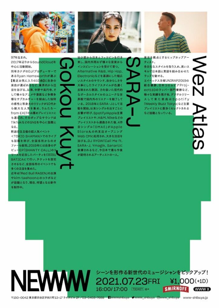 7月23日(金祝) WWWレギュラー企画「NEWWW」が開催決定!今回のアクトはGokou Kuyt、SARA-J、Wez Atlasの3組。 2021/06/25 13:08 拡大する WWWレギュラー企画「NEWWW」が開催決定!今回のアクトはGokou Kuyt、SARA-J、Wez Atlasの3組。これまで、Suchmos、Yogee New Waves、never young beach、D.A.N.、DYGL、カネコアヤノ、TENDRE、んoonなど、新たなシーンを形作り始めた新世代のミュージシャンたちが出演してきた「NEWWW(ニュー)」。4月ぶりの開催となる今回のNEWWWは、R&BやHIPHOPの可能性を広げる3組が出演。 続きを読む