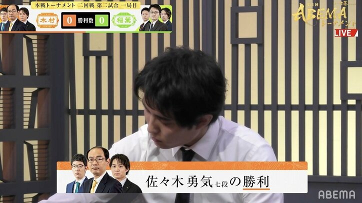 フィッシャー王子・佐々木勇気七段、稲葉陽八段の隙を逃さず鮮やか逆転勝利/将棋・ABEMAトーナメント 将棋 2021/08/14 19:12 拡大する プロ将棋界唯一の団体戦「お~いお茶presents第4回ABEMAトーナメント」の本戦トーナメント2回戦第2試合、チーム木村とチーム稲葉の対戦が8月14日に生放送され、チーム木村・佐々木勇気七段(27)がチーム稲葉のリーダー、稲葉陽八段(33)に124手で勝利した。【中継】お~いお茶presents第4回ABEMAトーナメント チーム木村VSチーム稲葉 相掛かりの出だしから始まった一局は、先手の稲葉八段がうまく序盤から指し回し、有利、さらには優勢としていたが、超早指しのフィッシャールールで輝く佐々木七段は、耐えながらも虎視眈々と逆転の機会に狙いを定めていた。すると中盤に稲葉八段の受けに緩手と思われる一手が見られたところをしっかりと咎め、そこから形勢逆転。さらに終盤には、一気呵成の攻めでリードを拡大し、稲葉八段に粘る暇さえ与えなかった。対局後には「このルールは最後ひらめくかどうかが大きい。結構手が震えていて、しびれましたね」とトップバッターを任された緊張感を口にしていたが、チームメイトの元に戻ると弾ける笑顔も見せていた。 続きを読む