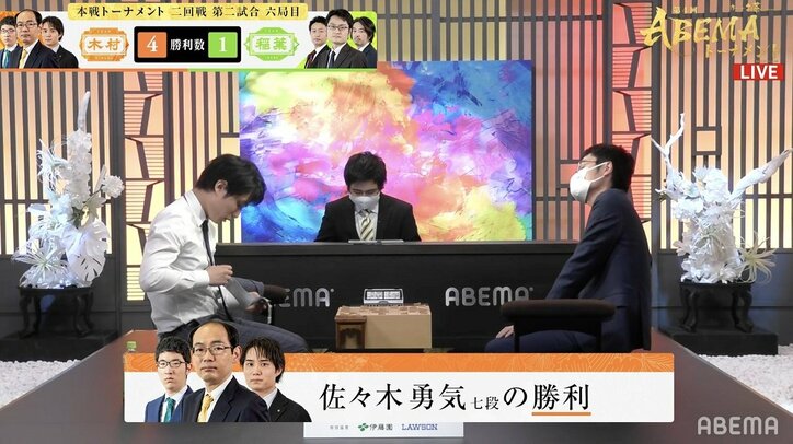佐々木勇気七段、激闘制し個人3連勝!チーム木村も準決勝進出/将棋・ABEMAトーナメント 将棋 2021/08/14 21:50 拡大する プロ将棋界唯一の団体戦「お~いお茶presents第4回ABEMAトーナメント」の本戦トーナメント2回戦第2試合、チーム木村とチーム稲葉の対戦が8月14日に生放送され、第6局でチーム木村の佐々木勇気七段(27)が、チーム稲葉のリーダー・稲葉陽八段(33)に111手で勝利した。佐々木七段はこの試合で3局全勝。チームもスコア5-1で勝利を決め、準決勝に進出した。【中継】お~いお茶presents第4回ABEMAトーナメント チーム木村VSチーム稲葉 続きを読む