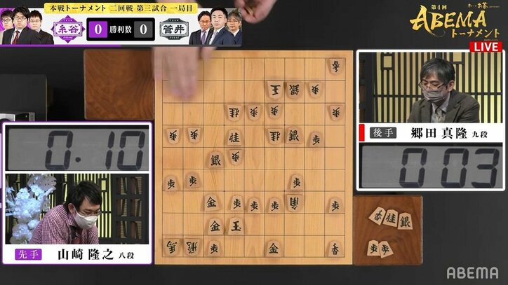 残り2秒だからの激レアシーン 右手で駒を取って左手でキャッチにファン「二刀流だ」/将棋・ABEMAトーナメント 将棋 2021/08/22 10:00 拡大する プロ将棋界唯一の団体戦「お~いお茶presents第4回ABEMAトーナメント」の本戦トーナメント2回戦第3試合、チーム糸谷とチーム菅井の対戦が8月21日に生放送されたが、この第1局において公式戦ではまず見られない珍しいシーンが誕生した。【動画】ベテラン棋士も思わず慌てたシーン 対局者はチーム糸谷・山崎隆之八段(40)と、チーム菅井・郷田真隆九段(50)。準決勝進出をかけた大事な初戦ということもあり、両者とも気合を入れて盤に向かっていた。珍しいシーンが生まれたのはお互い、残りの持ち時間が10秒を切る最終盤。1手指すごとに5秒加算するとはいえ、毎回数秒以内に指さなくてはいけない緊張の連続だった。 続きを読む