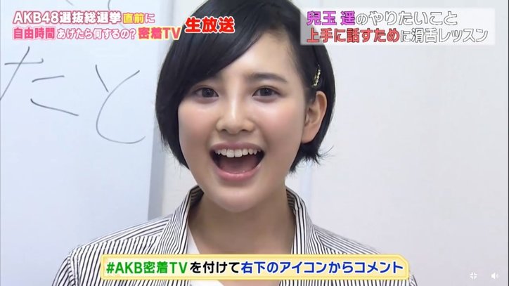 HKT48・兒玉遥、コンプレックス克服に苦戦!! 生密着番組に「ひとりだけでは不安」 2019/03/15 09:36 拡大する 7日20時から、AmebaSPECIAL PLUSチャンネルにて『AKB48選抜総選挙直前に自由時間あげたら何するの密着TV』と題して、HKT48・チームH/AKB48・チームKを兼任する“はるっぴ”こと兒玉遥の総選挙直前“生密着”番組の放送がスタートした。(兒玉遥(HKT48/AKB48『755』より)テンション高めに登場した兒玉は、地元・博多ではなく東京・八王子に初上陸。ちょっとカミカミなオープニングトークから、「ひとりだけでは不安なので……」「ひとりで2時間持たせられるかな?」と不安げな表情を見せつつ、まず選んだ訪問先は<VERY MERRY MUSIC SCHOOL 八王子校>。以前から“サ行”の発音が苦手で、滑舌が微妙だという兒玉は今回、同校でプロの先生から滑舌レッスンを受けたいのだという。 続きを読む