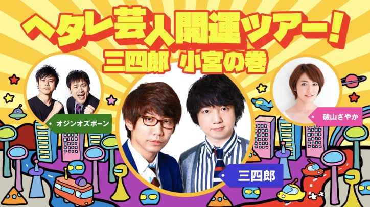 ヘタレ芸人、三四郎・小宮 開運ツアーで「ヘタレ卒業」宣言 2019/03/15 09:36 拡大する 6月26日夜7時より『ヘタレ芸人開運ツアー!~三四郎小宮の巻~』がAbemaTVのSPECIAL PLUSチャンネルで放送される。同番組はAbemaTV初出演のお笑いコンビ・三四郎の相田周二と 最近"ヘタレ芸人”として大注目を集めている小宮浩信が、最悪の状況を回避するための「運気」を身につけようと、マイクロバスに乗って「開運」に関する様々なジャンルのスペシャリストの元を訪問し、本当に最強運になったのか検証していくというもの。 続きを読む