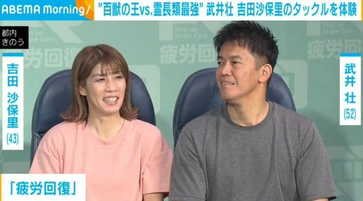 【写真・画像】“霊長類最強”吉田沙保里と“百獣の王”武井壮、疲労回復法を明かす 2枚目 ABEMA Morning吉田沙保里,武井壮 2026/02/10 14:15 画像2枚目/3枚 武井壮と吉田沙保里 記事を読む 【映像】ABEMAでみる ▼スクロールで次の画像をみる▼ 【画像】武井壮、吉田沙保里のタックルを受ける瞬間 【映像】武井壮、愛車のフェラーリを披露 澤穂希、肩を寄せあう夫婦ショットに反響「お似合いですね!」 Twitter