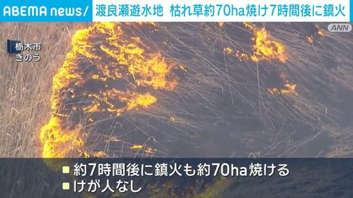 【写真・画像】渡良瀬遊水地 枯れ草約70ha焼け7時間後に鎮火 1枚目 速報 2026/02/28 09:56 画像1枚目/2枚 燃えるヨシの枯れ草 記事を読む 【映像】ABEMAでみる ▼スクロールで次の画像をみる▼ 【画像】渡良瀬遊水地のヨシが燃え広がる様子 【映像】林家ペー、火事で全焼した自宅へ「貯金はほとんどない」 激しく立ち上る黒煙と炎…郵便局のバイクなど28台が燃える火事