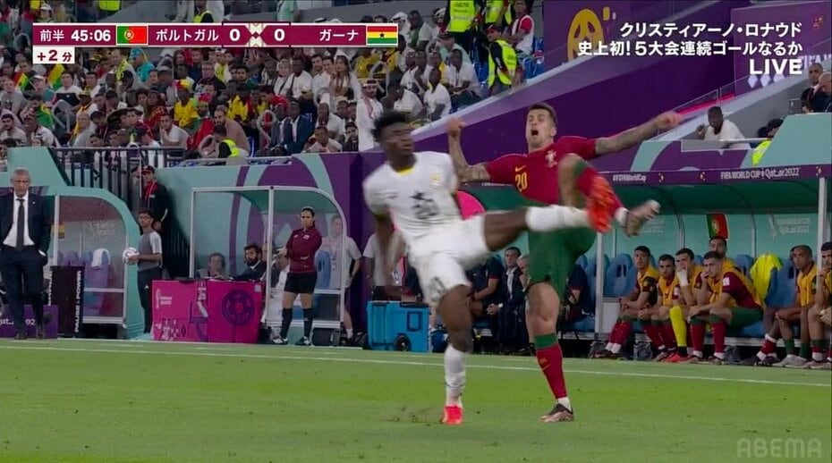 悲痛な叫びがスタジアム全体に響きわたった。この声の主はポルトガル代表DFカンセロ。彼の足先にガーナ代表MFクドゥスのジャンプキックが炸裂したのだ。スパイクの裏が勢いよく足に直撃したこともあり、視聴者からは「カンセロ大丈夫かよ」と心配の声が相次いでいる。